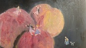 食べ物への感謝と生命の巡りが、そっと描かれています。背景の深いブルーが、桃の柔らかな色味をより引き立て、幻想的な世界へと誘います。