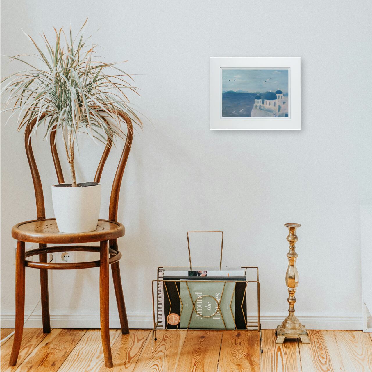 地中海の輝く陽光と碧い海、白壁と青いドームが織りなすギリシャ・サントリーニ島の景色を描きました。鮮やかなブルーと白のコントラストは、リビングや玄関など空間を爽やかに彩り、日常に地中海の風を運びます。