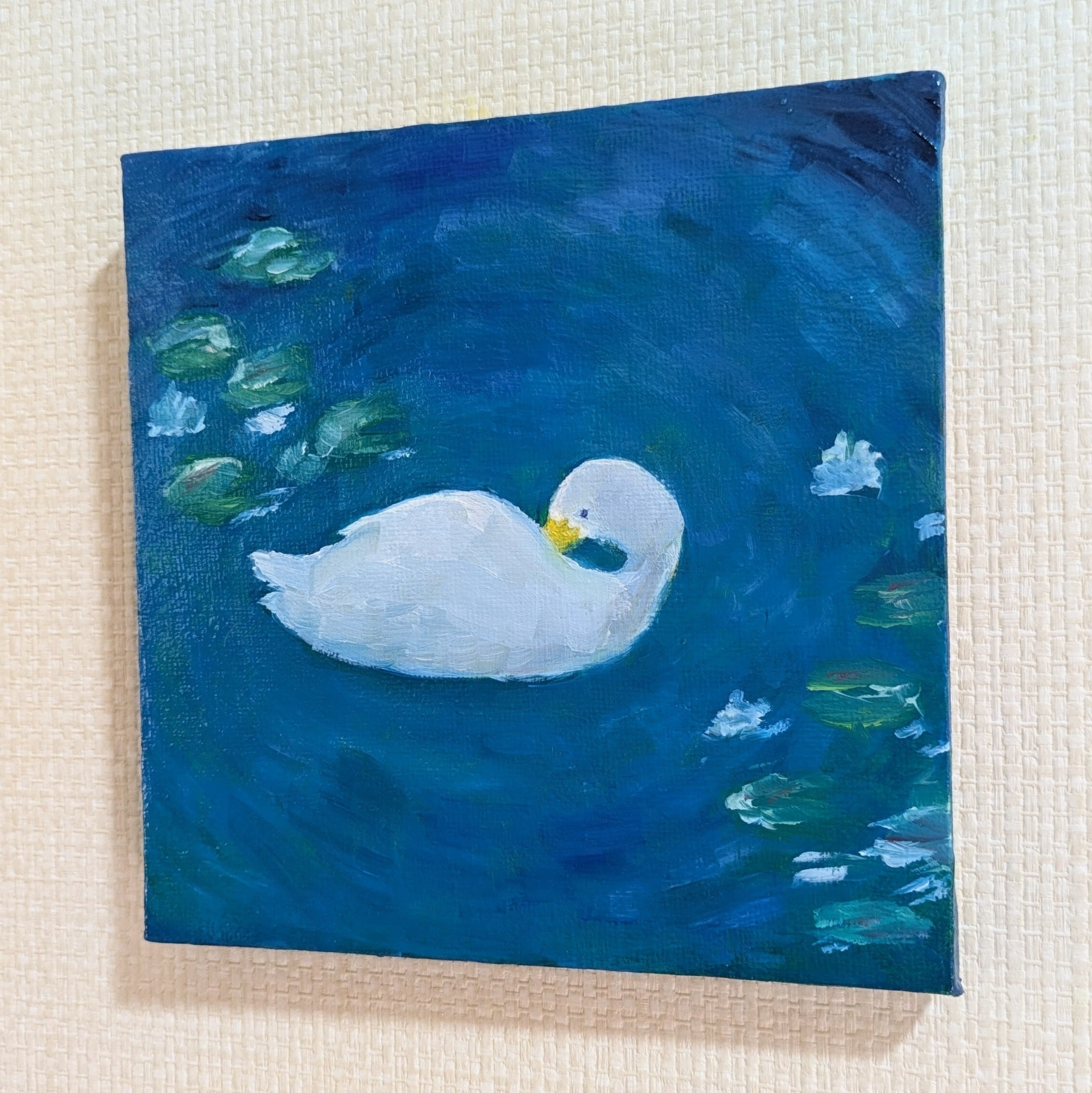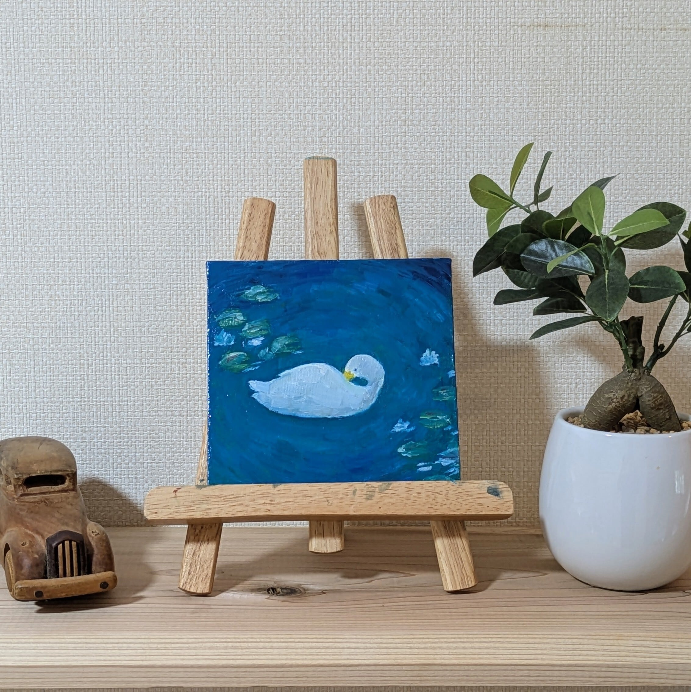 青く深い水面に、白いアヒルがそっと浮かぶ様子を描いた油彩作品です。周囲には睡蓮の葉がゆらぎ、穏やかな時間が流れています。