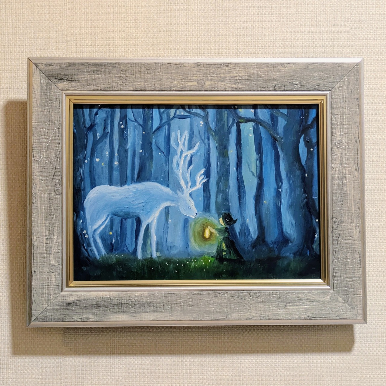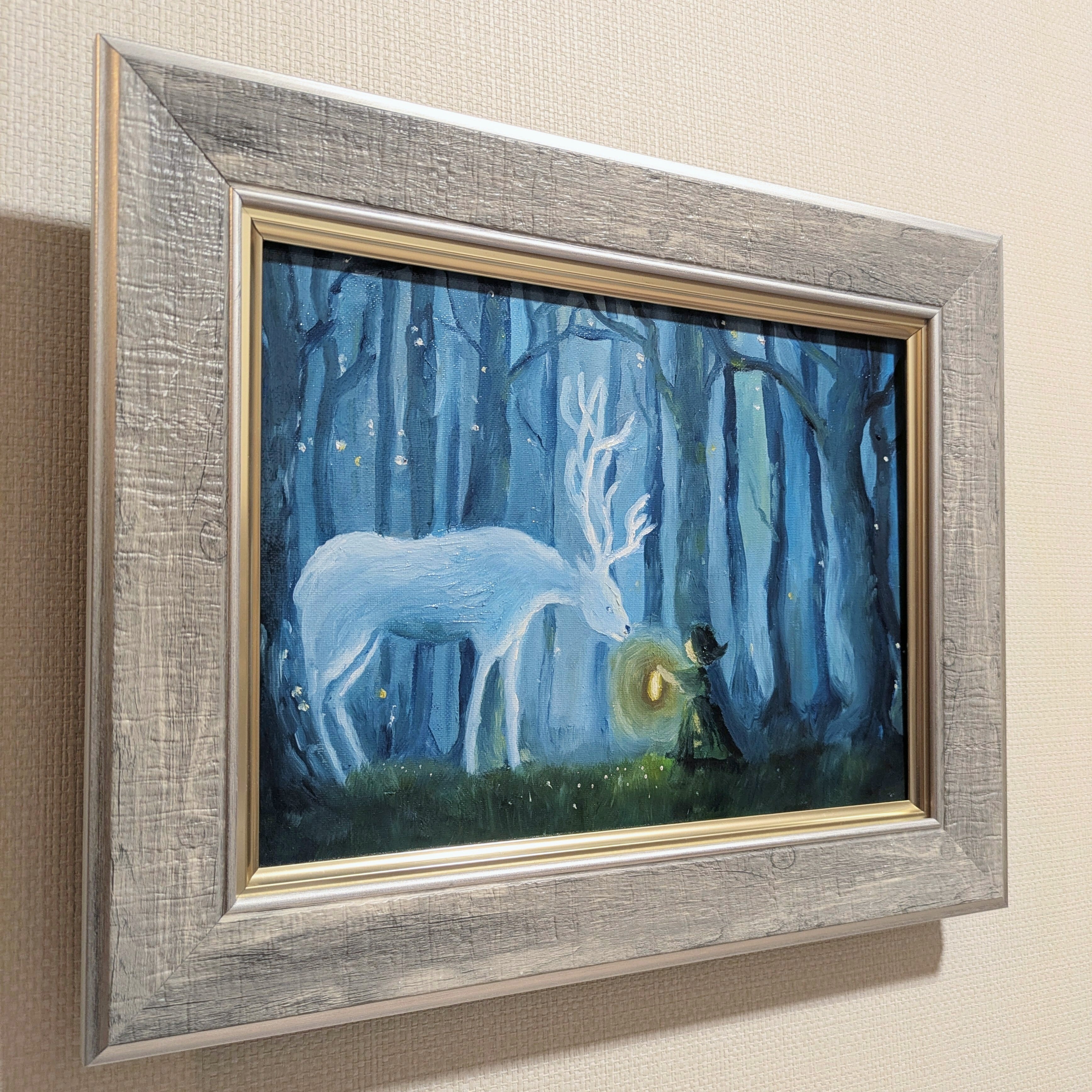 深い青の森で、迷い子の少女が“森の守り神”と出会う神秘的な瞬間を描きました。